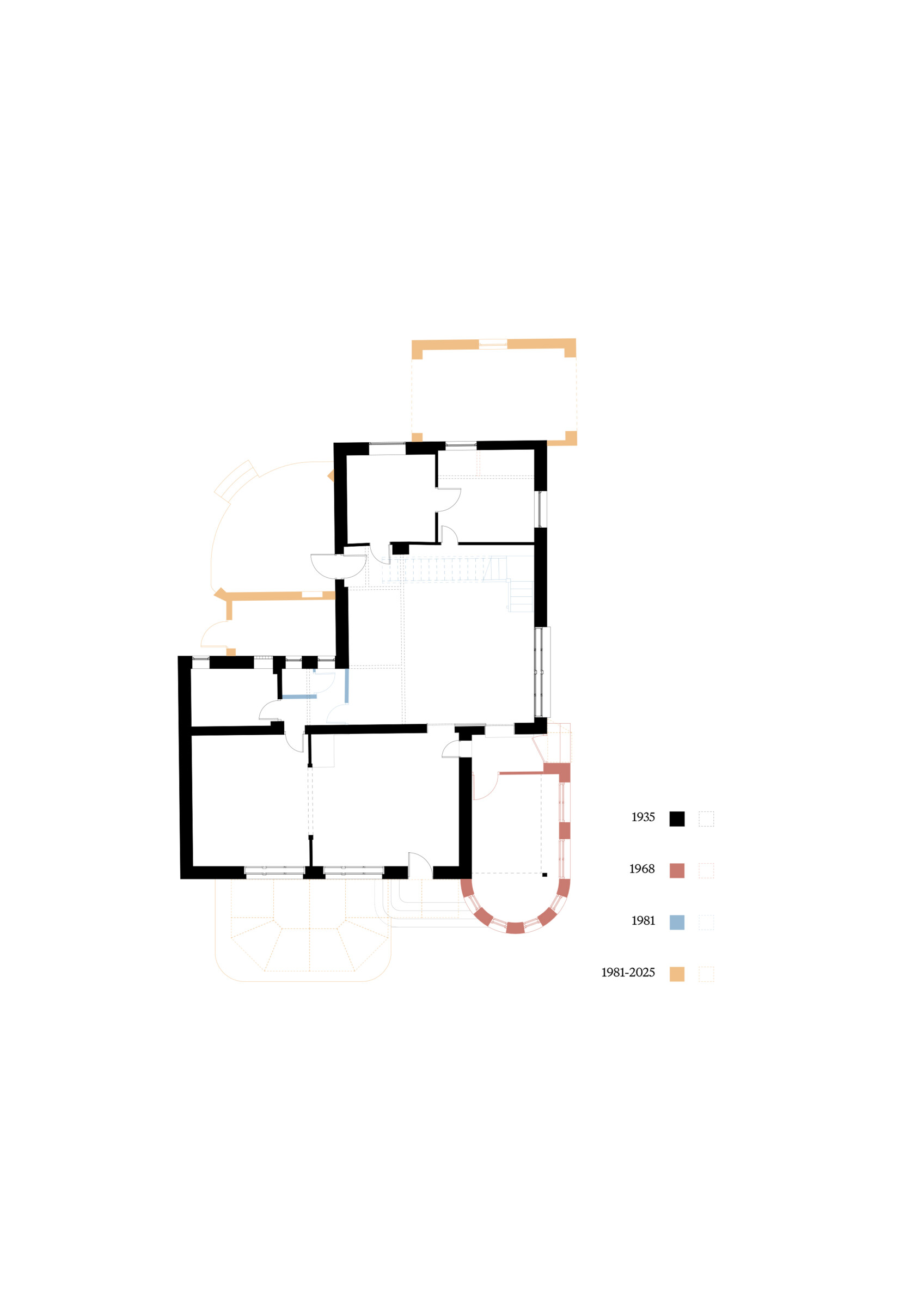Our intellectual premise was clear from the outset: the small holiday house built in 1935, later extended in the early 1980s and again in the early 1990s, is not a listed building and has no protected status. Its architectural value is not exceptional, and the layers of successive renovations—some of higher, others of lesser quality—remain visible to this day. Nevertheless, the house is significant. It was the former home of Péter Esterházy, an internationally recognized figure not only in Hungarian literature but in Hungarian culture more broadly, and many of his most important works were written within its walls. This fundamental premise justified our approach: wherever possible, we sought to preserve and renovate the original structures and materials, and, where necessary, to reconstruct elements of the building’s earlier architectural character. Only minor corrections were introduced—interventions that did not alter the essential atmosphere of the house but were warranted within a renovation of this scale. In simple terms, through careful consideration and extensive consultation, our aim was to ensure that anyone passing by would perceive the building—inside and out—as essentially unchanged, as it once was.