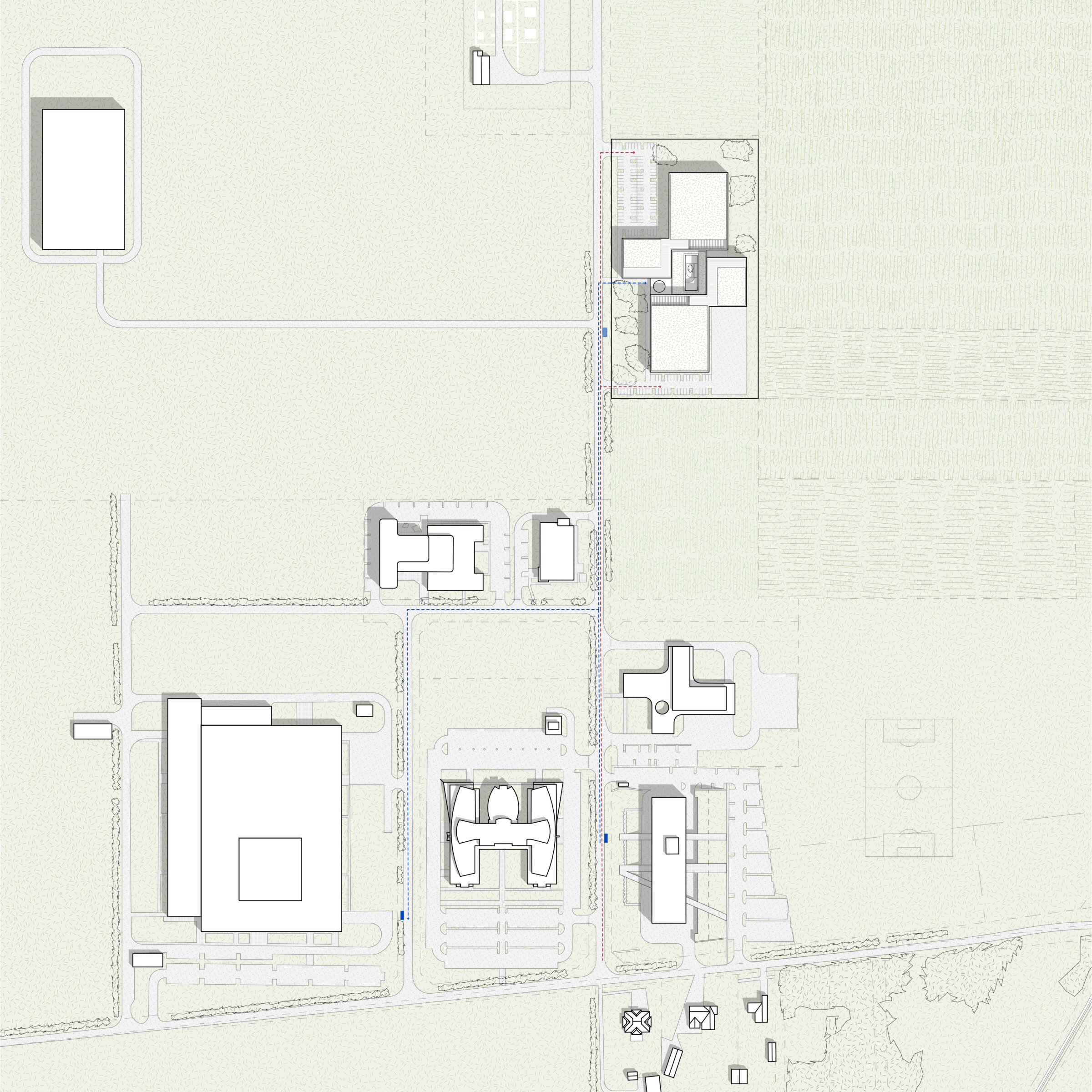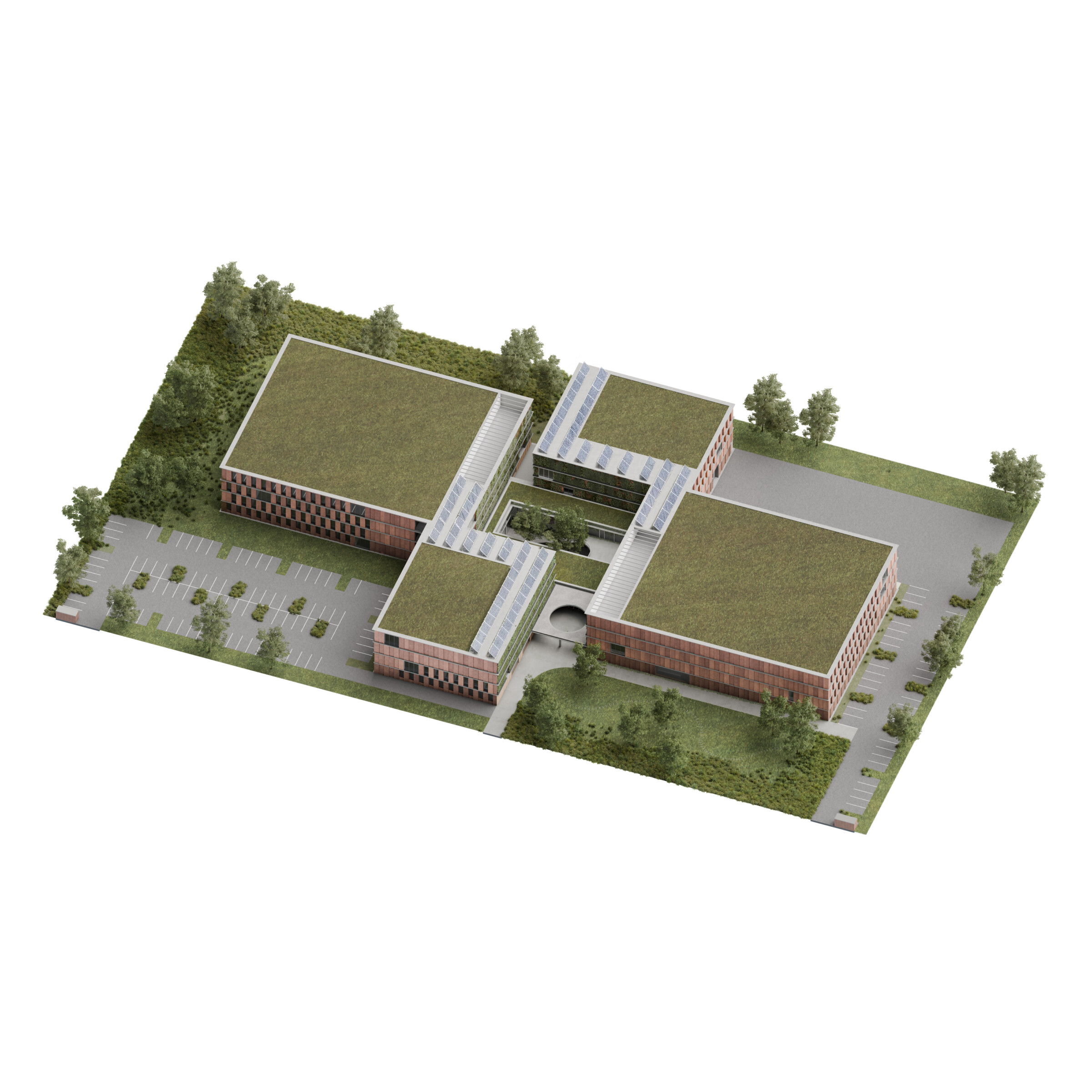 - Oldott tömegű épület: a nagyméretű programot több, kisebb léptékű épületszárnyban helyeztük el, amely tagolt kompozíciót eredményezett. A különböző tömegek segítségével az épület körül eltérő funkciójú kertrészek alakulnak ki: előtér, közönségforgalmi parkoló és üzemi feltöltés, dolgozói parkoló és hátsó kert, megtartva és kiemelve az épület középület-jellegét, főbejáratának és közönségforgalmi tereinek rangját.