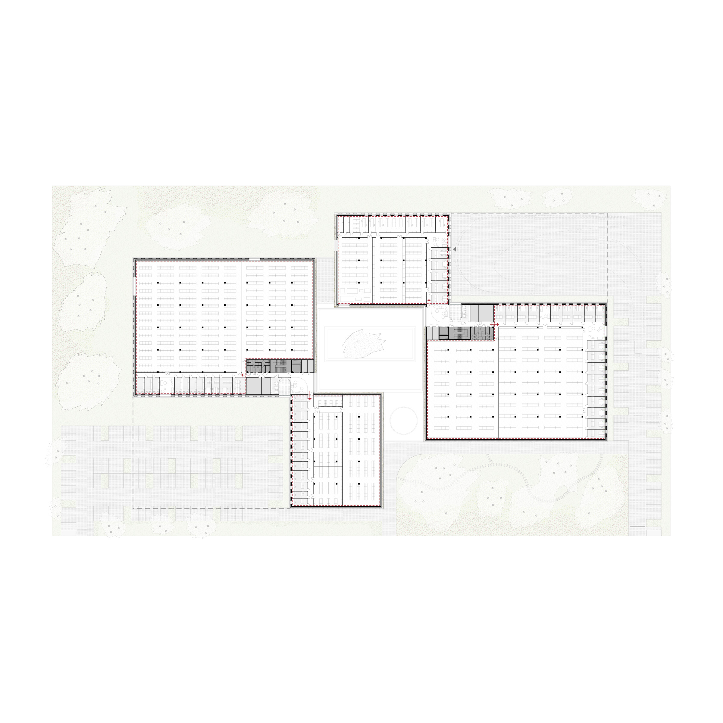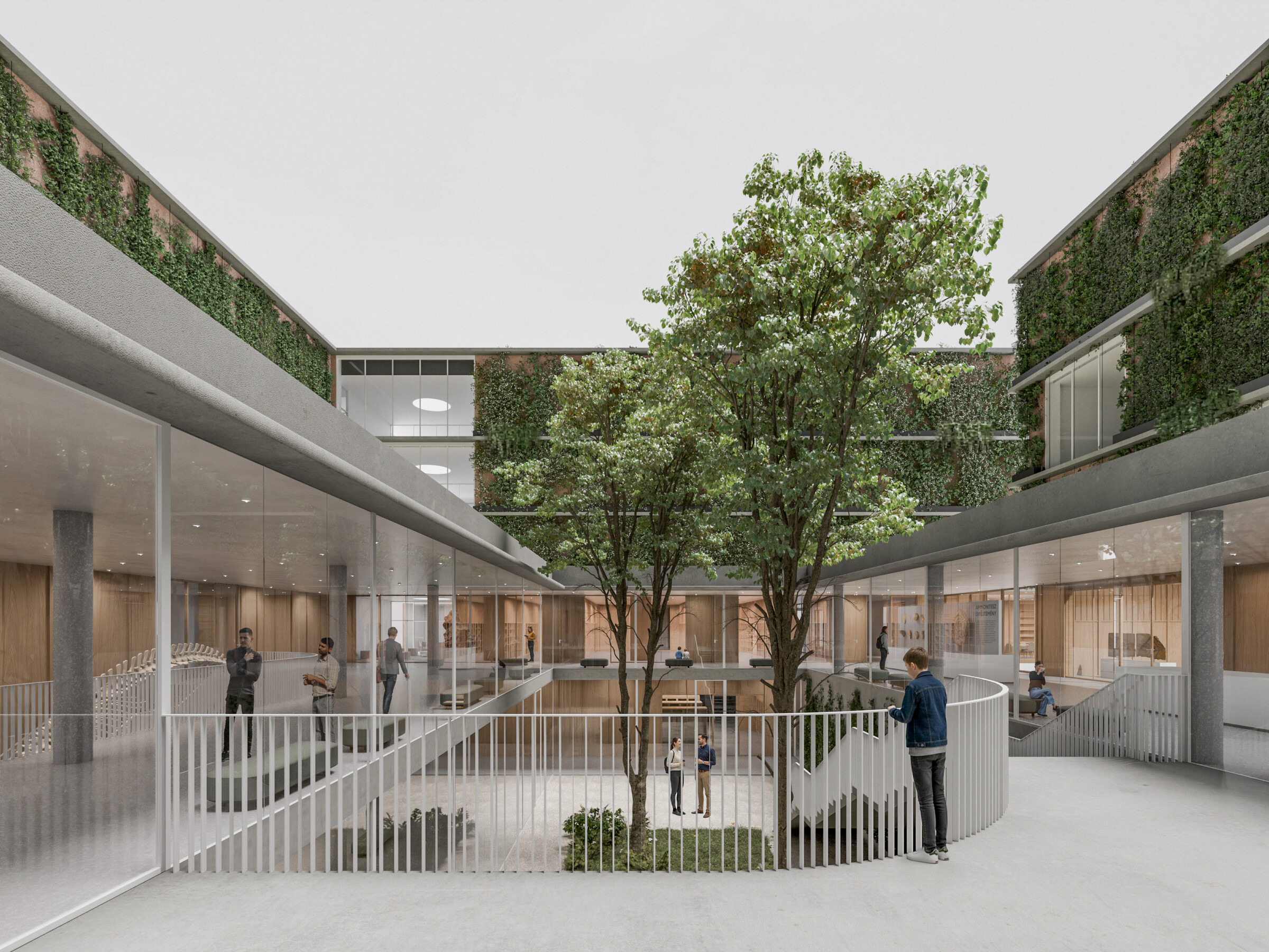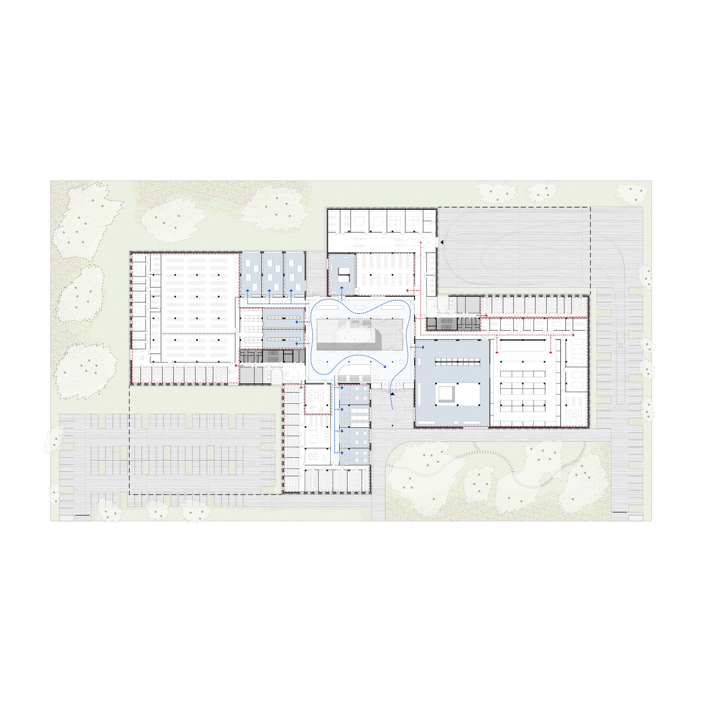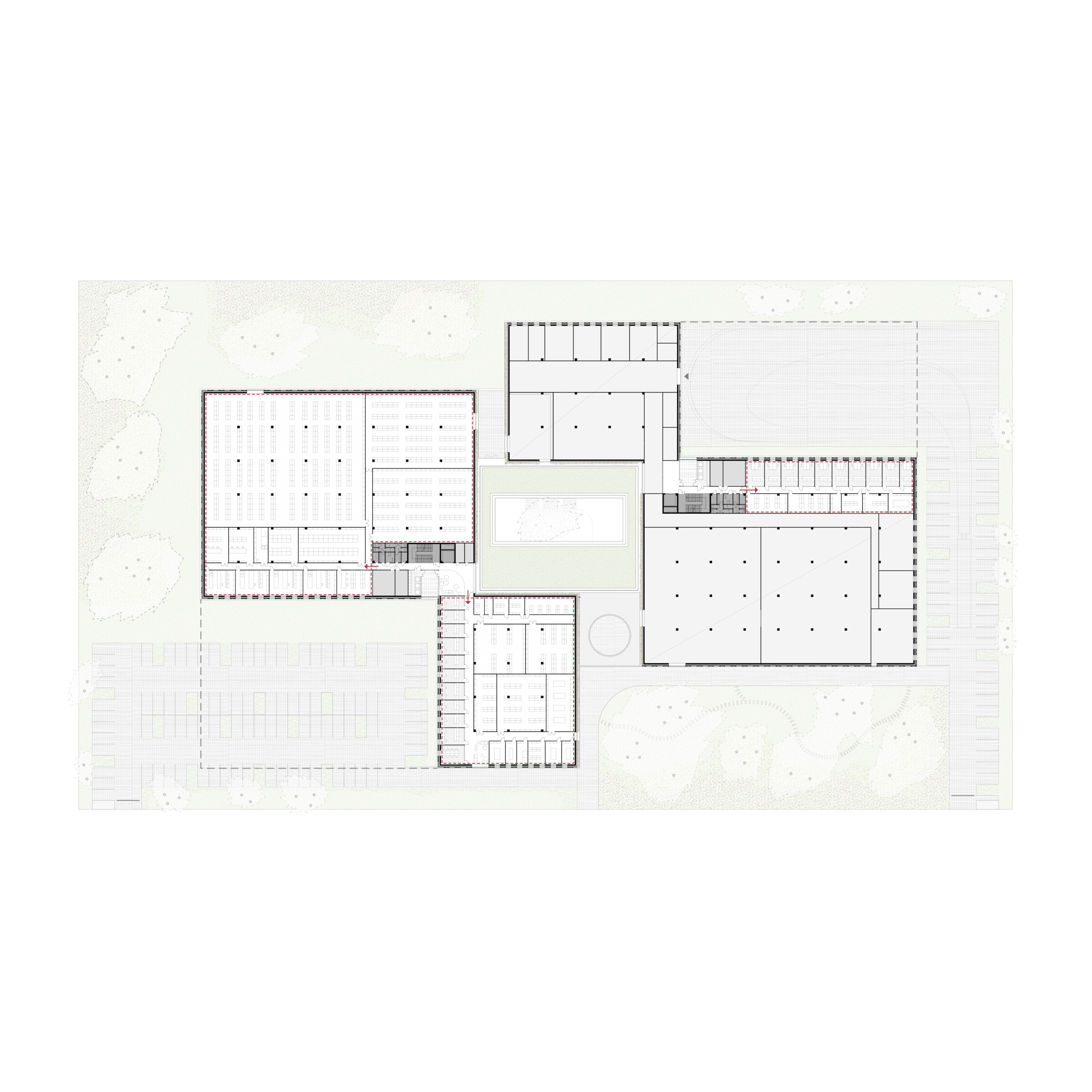 - Az épületegyüttes zöld központja: a különböző épületszárnyak, és a földszint ill. az alagsor esetében a közönségforgalmi terek koncentrálása, rendezése az épület közepén kialakított, intenzív zöld átrium és azt körülvevő körbejárható aula köré az egész térszervezés kulcsmotívuma. Az átriumudvar afféle zöld oázisként szervezi a központi közlekedőtereket, ugyanakkor az két főtömeg udvar felé néző zöldhomlokzata is – annak klimatikus hatásain túl – erre erősít rá.