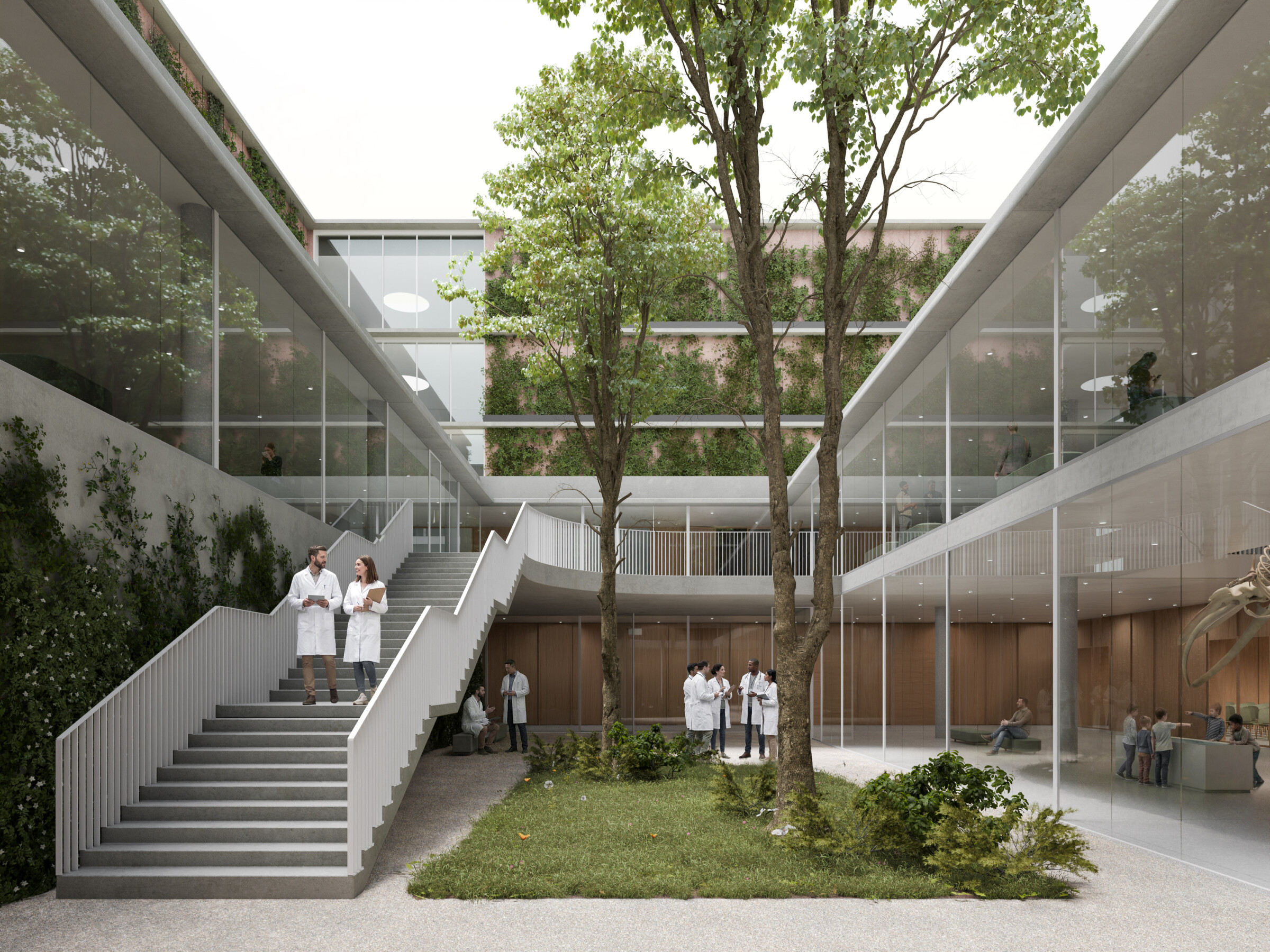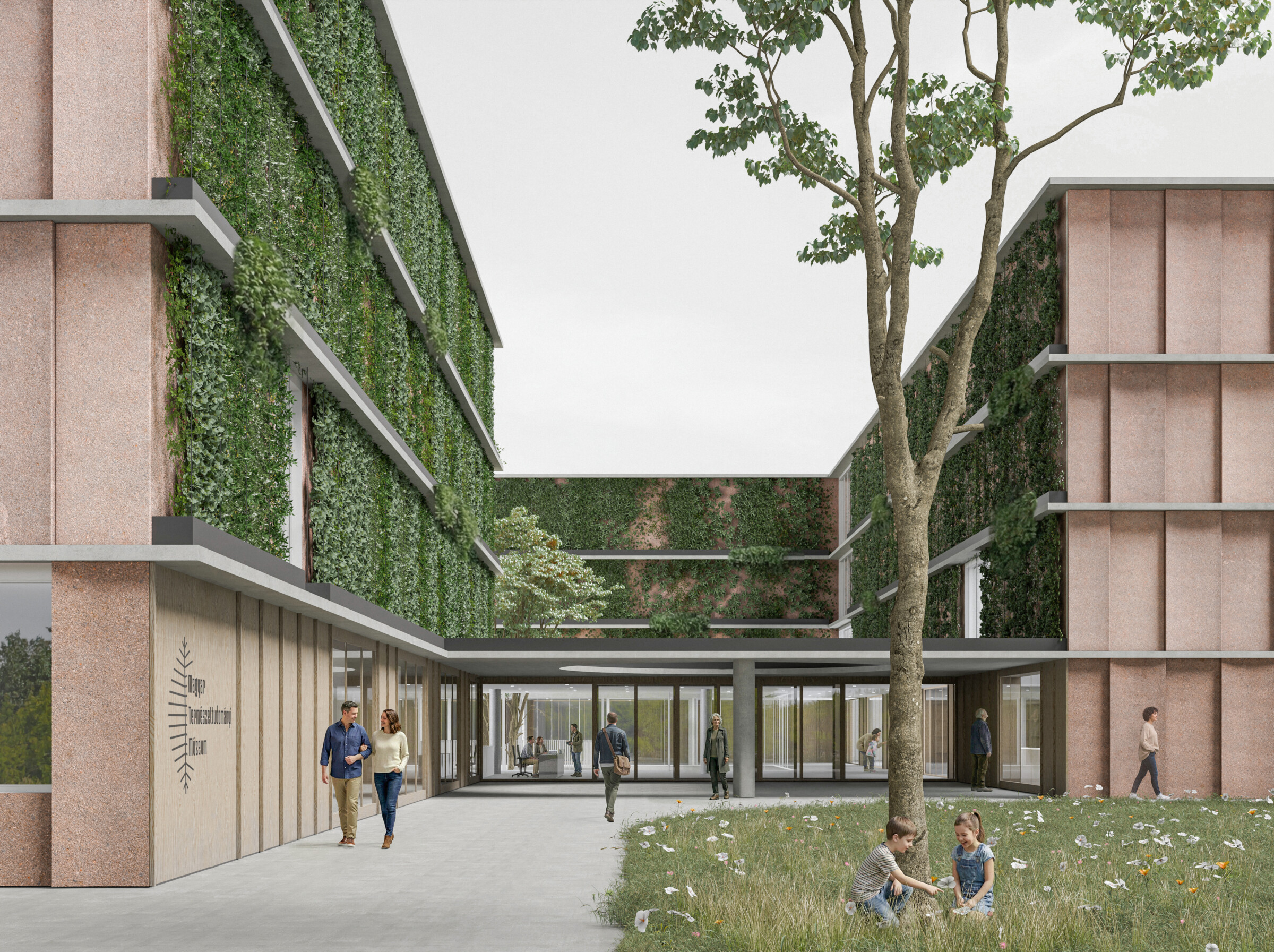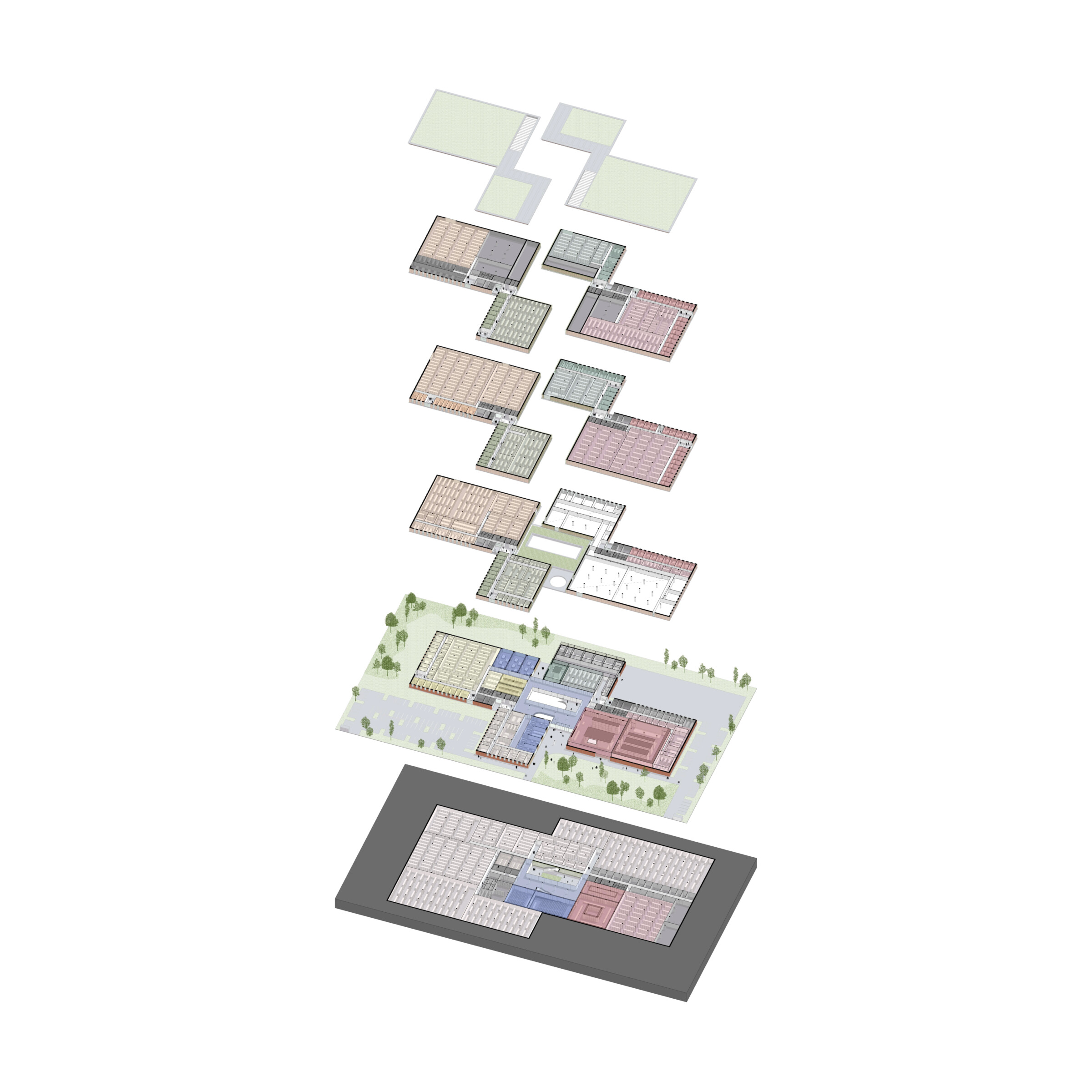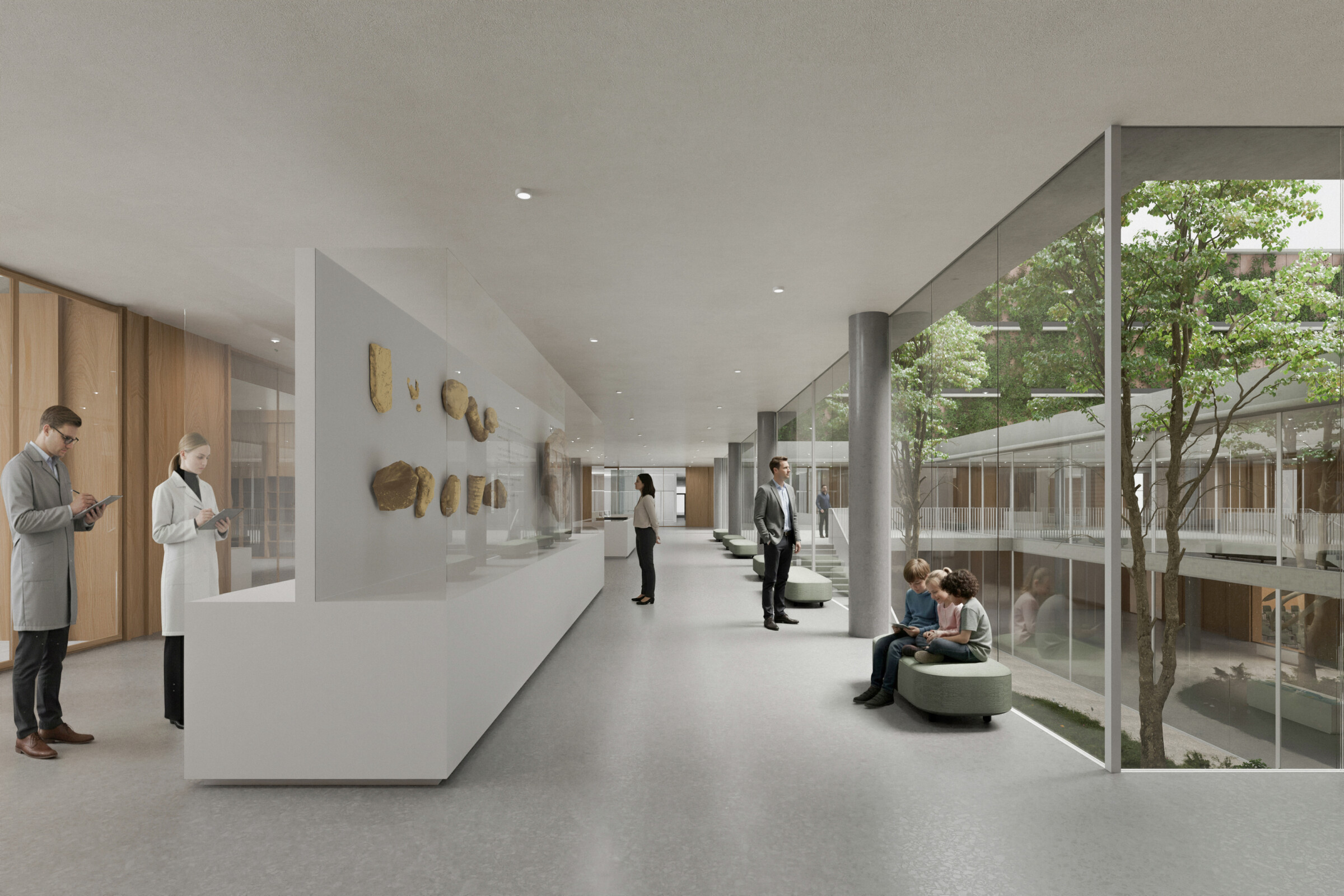 - Az épületegyüttes zöld központja: a különböző épületszárnyak, és a földszint ill. az alagsor esetében a közönségforgalmi terek koncentrálása, rendezése az épület közepén kialakított, intenzív zöld átrium és azt körülvevő körbejárható aula köré az egész térszervezés kulcsmotívuma. Az átriumudvar afféle zöld oázisként szervezi a központi közlekedőtereket, ugyanakkor az két főtömeg udvar felé néző zöldhomlokzata is – annak klimatikus hatásain túl – erre erősít rá.