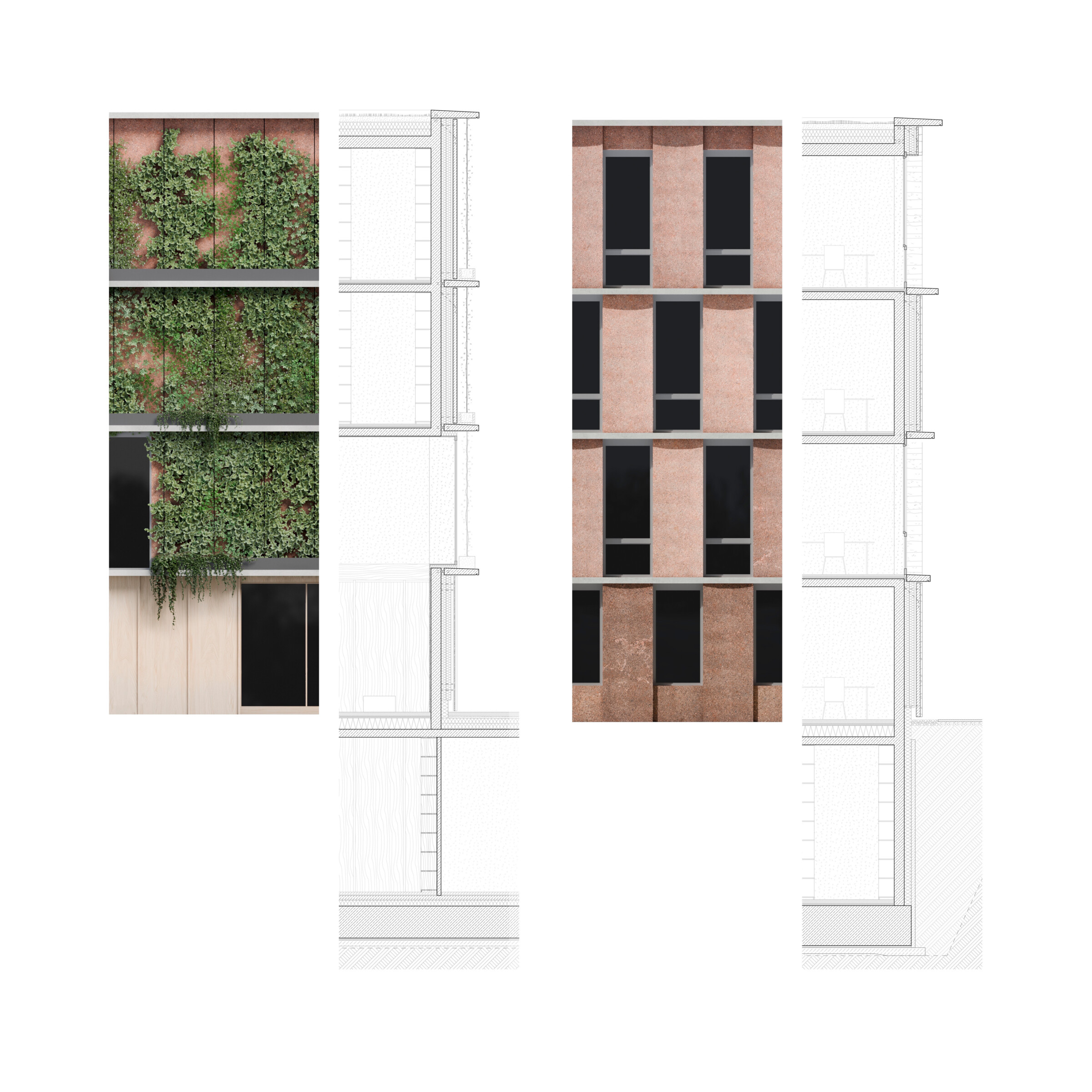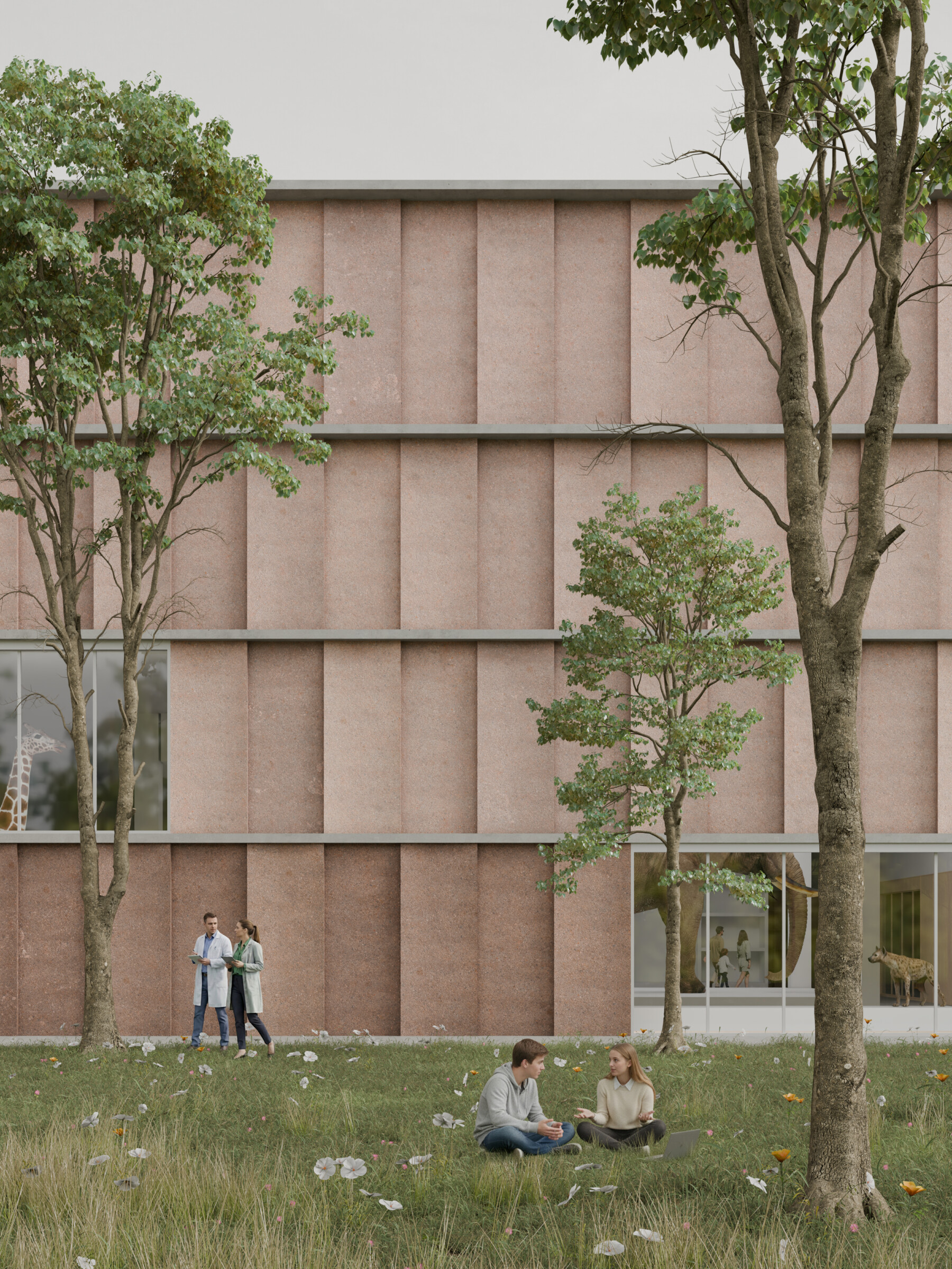 - Természetes anyagok és fenntartható kialakítás: a lehetőségek mértékéig törekedtünk természetes építőanyagokat, minimális helyszíni élőmunkát megkövetelő munkafázisok, megújuló energiaforrások és korszerű gépészeti rendszerek alkalmazására. Így pl. az előregyártott vasbeton szerkezetek mellett a homlokzaton a helyi agyagos földet felhasználó csömöszölt beton paneleket terveztünk, utalva az egykori közeli téglagyár emlékezetére, de a természettudományi rendeltetésre is.