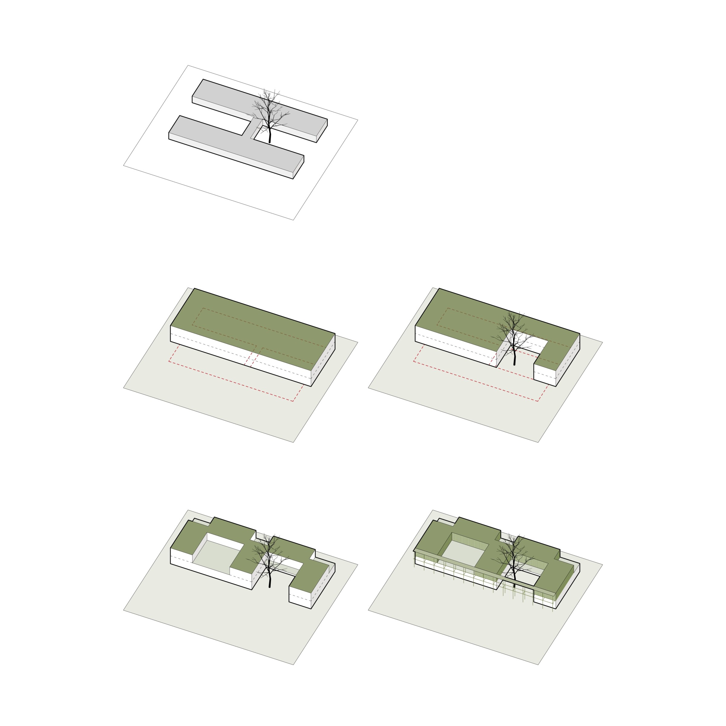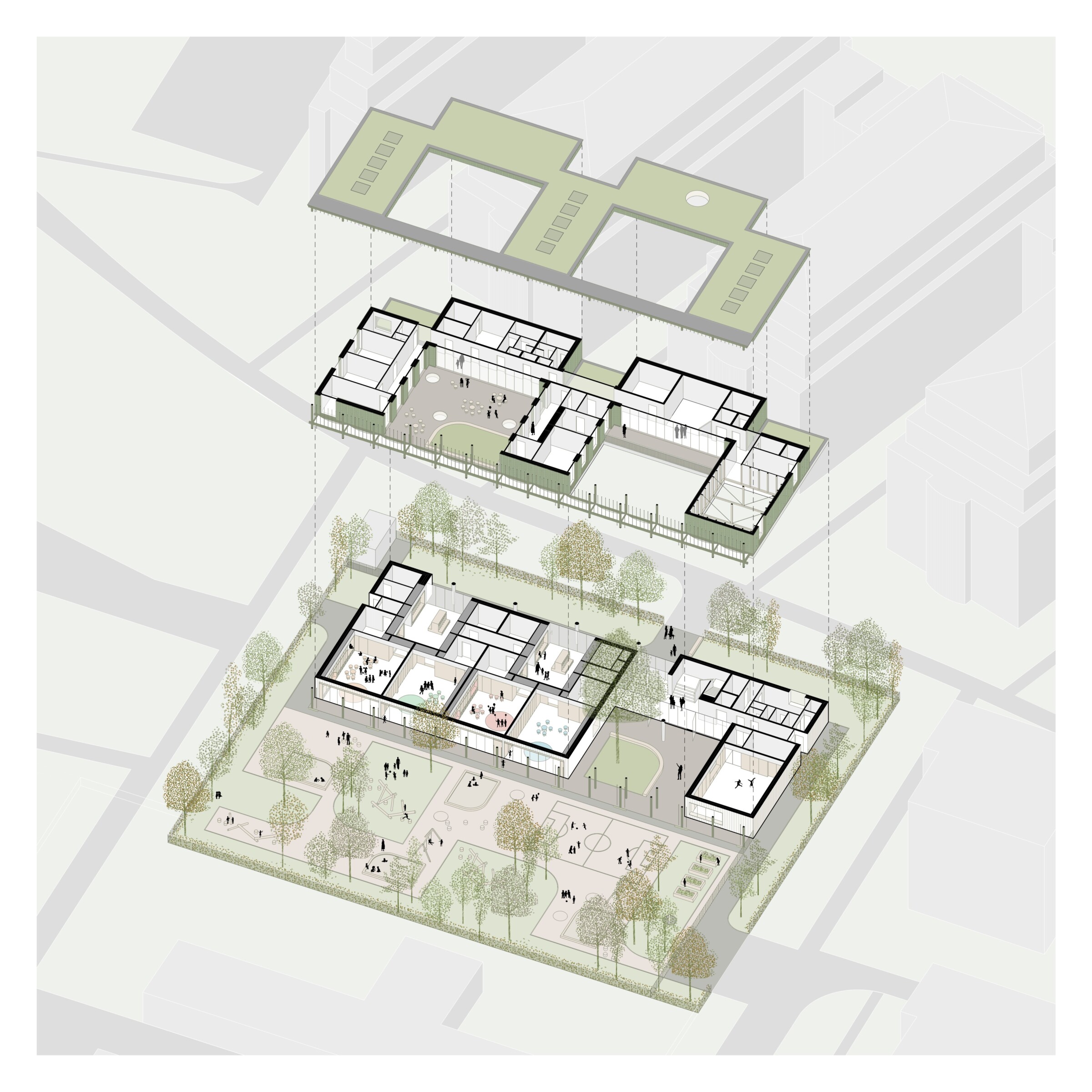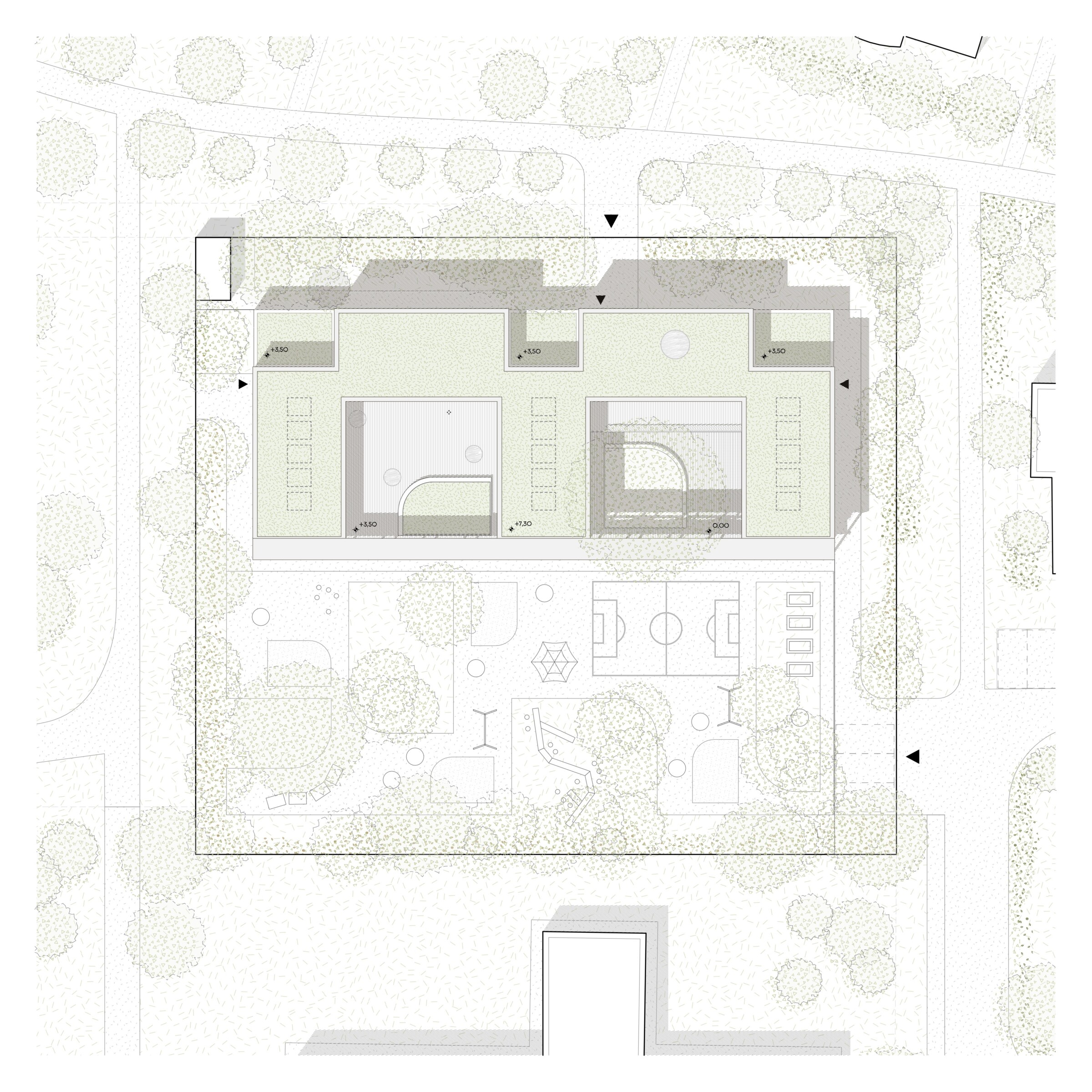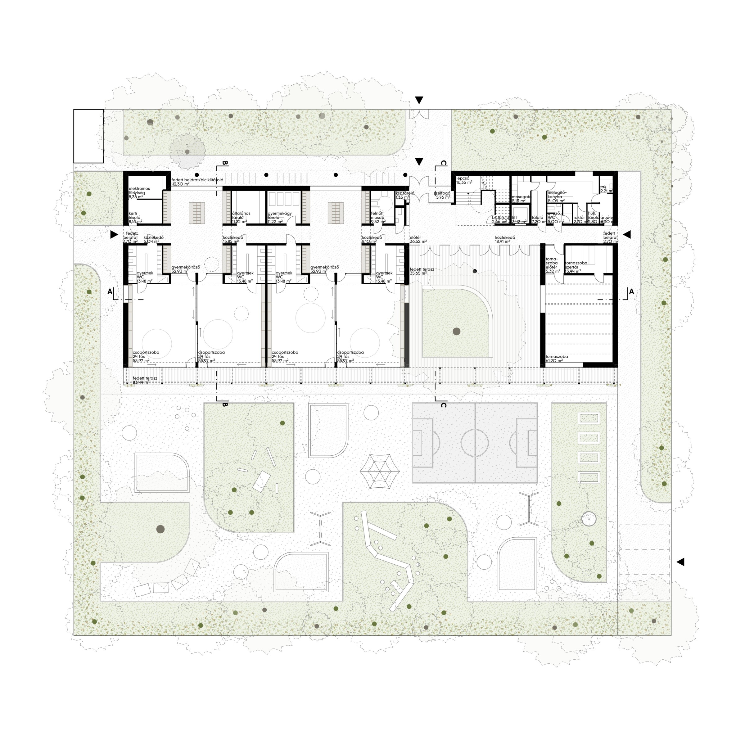 - a legkisebb “LÁBNYOM” elve: új épület építése a bontandó épület helyén, kompakt, gazdaságosan megépíthető kialakítás, a legkisebb “lábnyom”, a zöldfelület és a játszóudvar területének maximalizálása