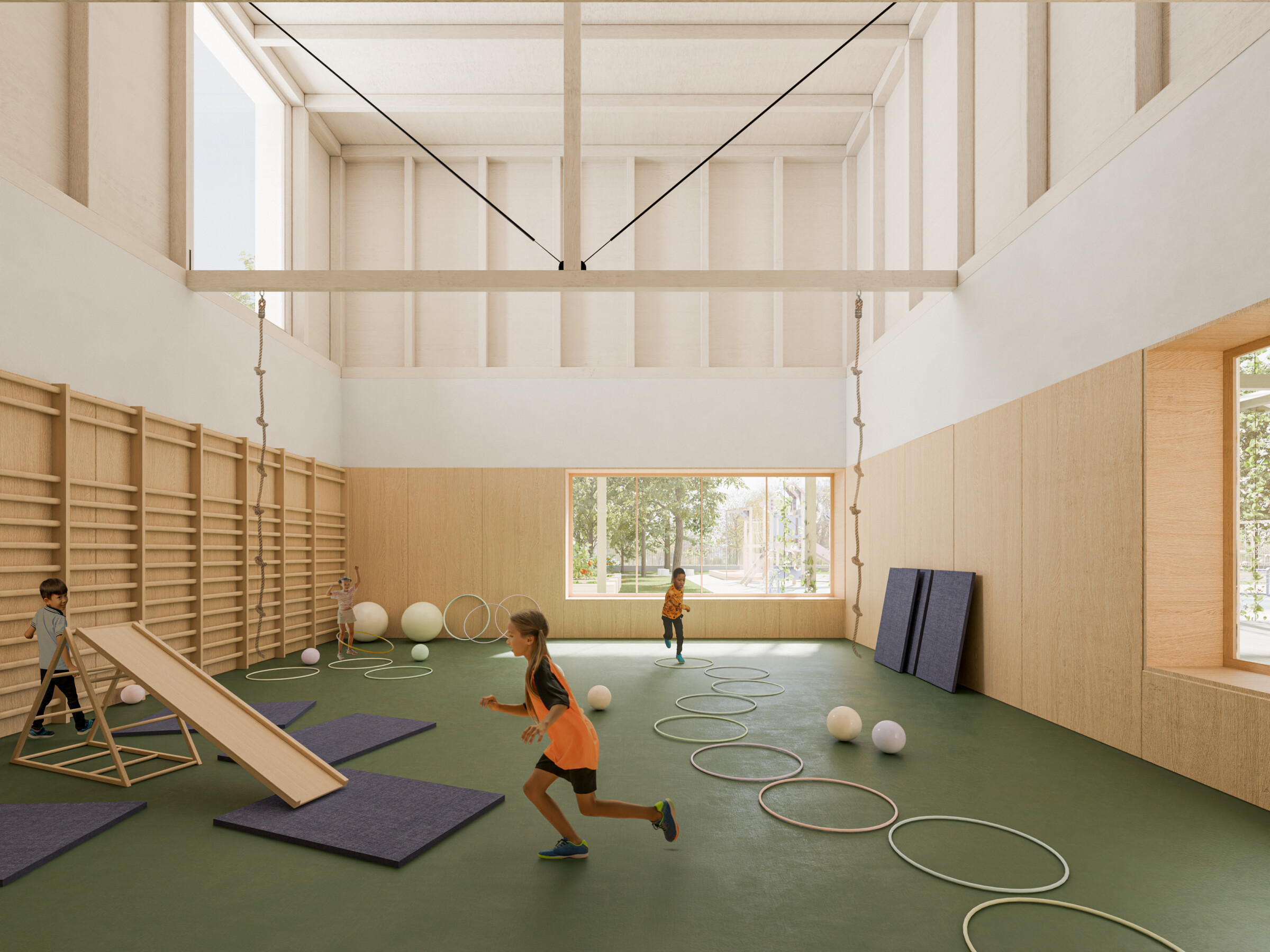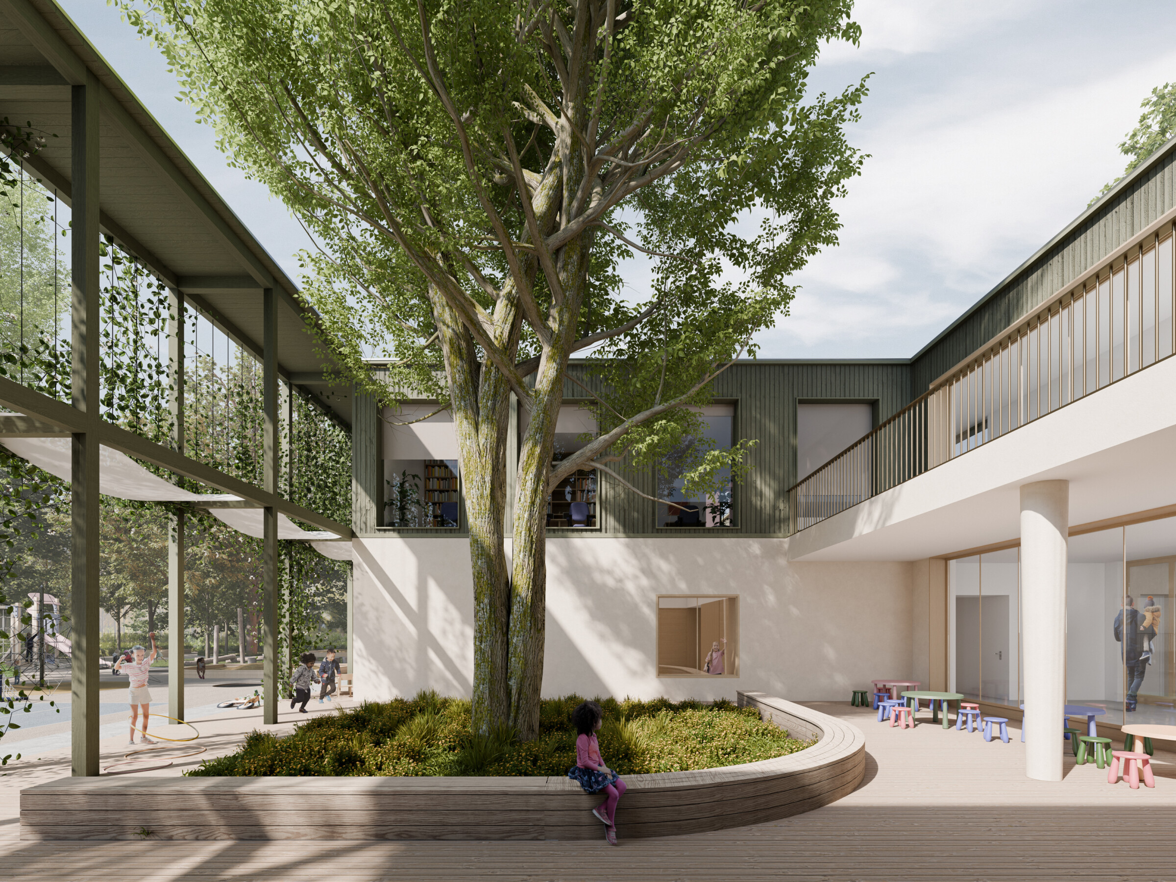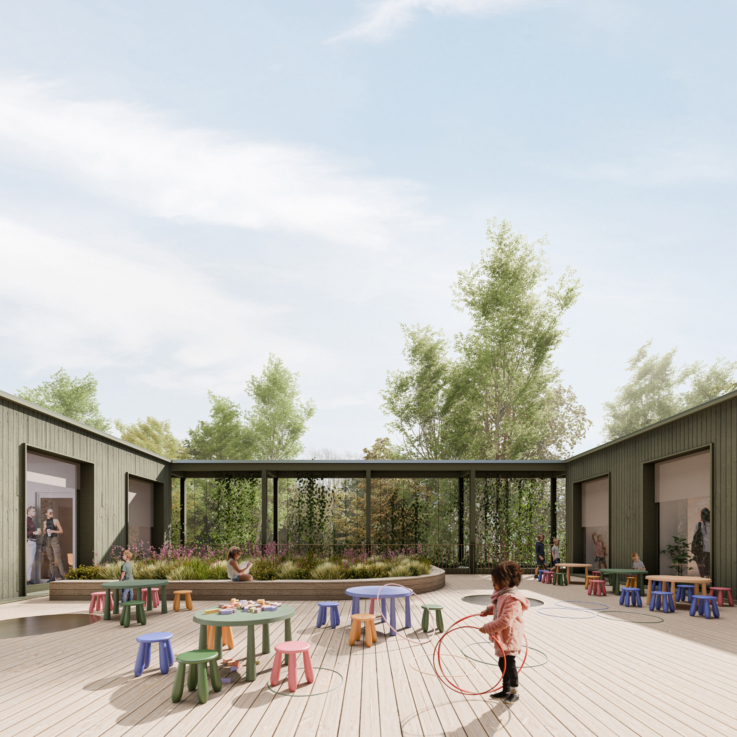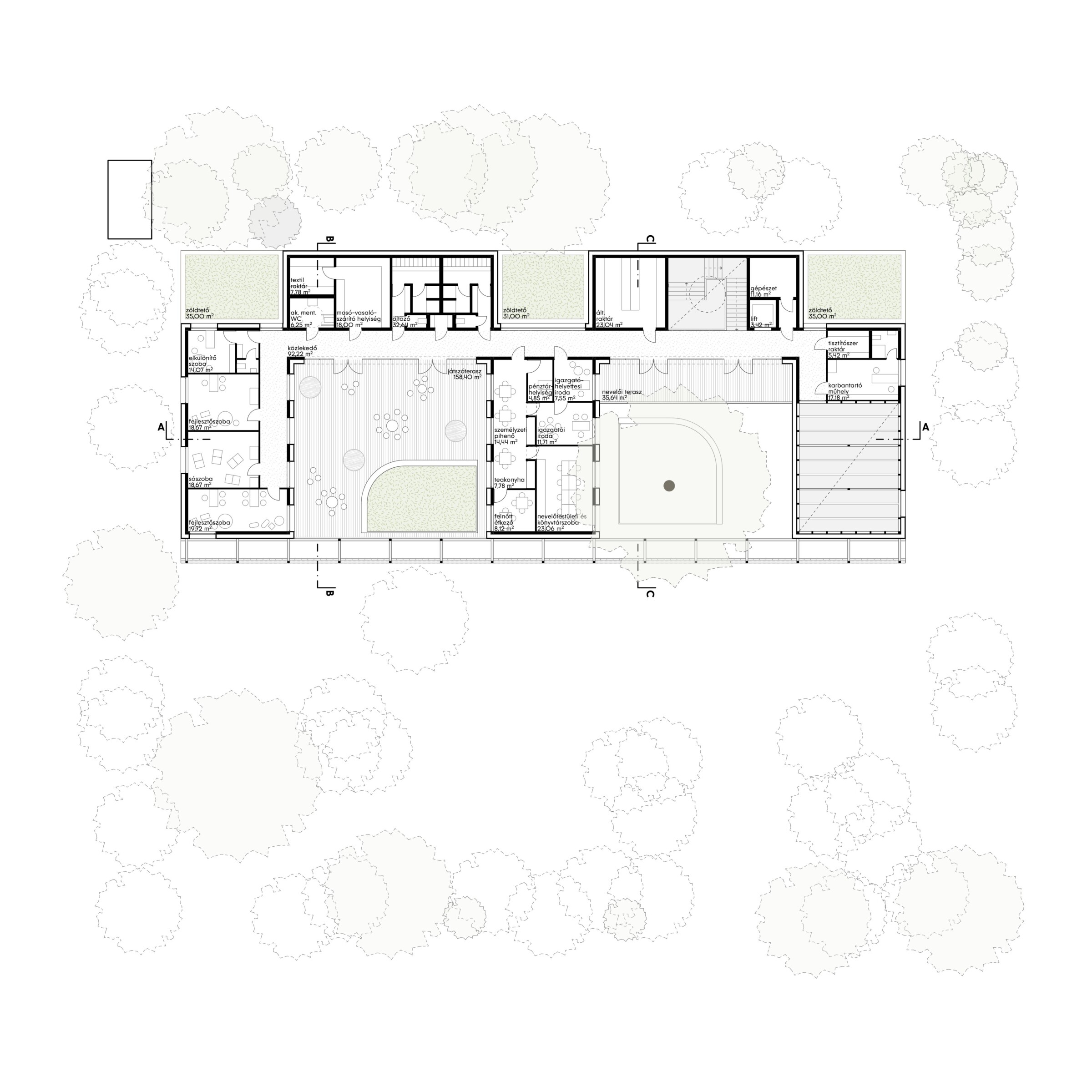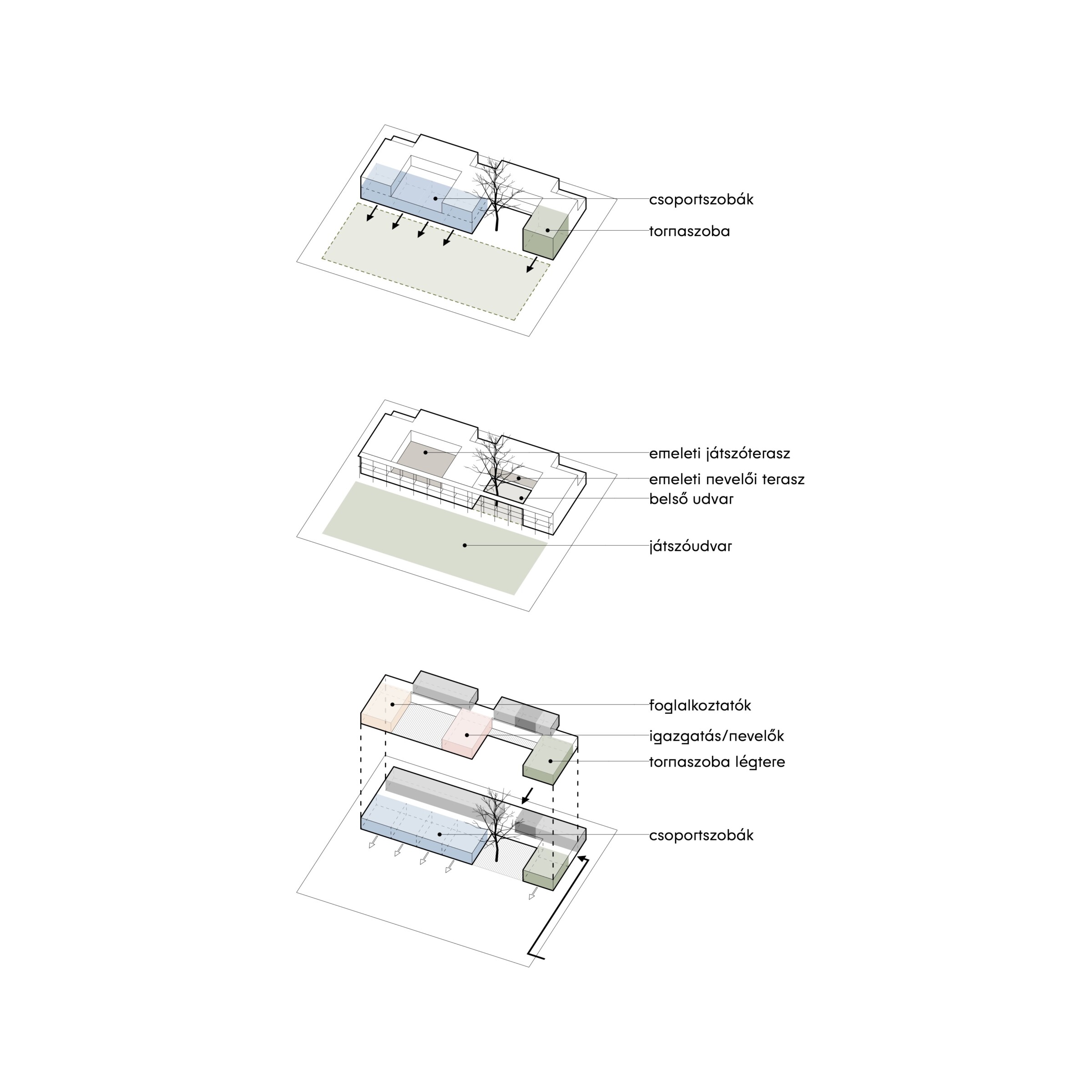 - a legintenzívebb UDVARKAPCSOLAT elve: csoportszobák és tornaszoba délkeleti tájolással a földszinten, közvetlen kapcsolatban az udvarral, differenciált játszóudvar, változatos belső, külső és átmeneti helyzetek, teraszok, zárt és nyitott udvarok kialakítása